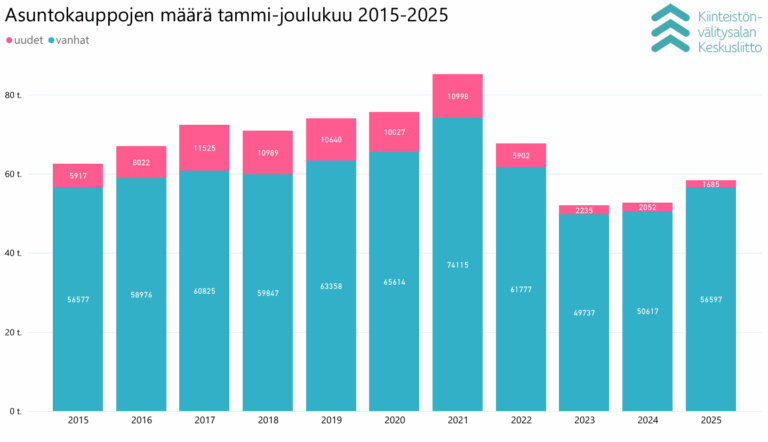 ”Vuosi 2025 oli vahvaa asuntokauppamäärien kasvua. Erityisesti vuoden ensimmäisellä neljänneksellä kauppamäärät kasvoivat selvästi. Koko vuoden asuntokauppamäärät kasvoivat yhteensä 10,7 prosenttia vuoteen 2024 verrattuna”, kertoo Kiinteistönvälitysalan Keskusliiton toimitusjohtaja Tuomas Viljamaa.