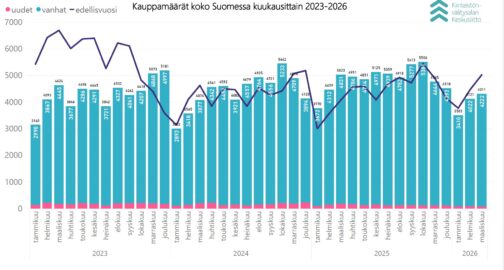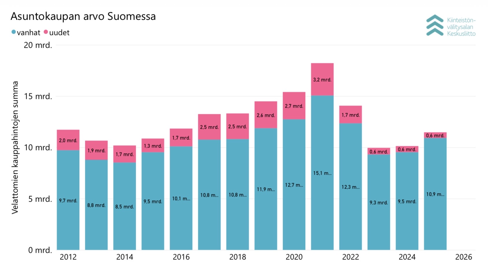 ”Käytettyjen asuntojen kauppamäärät ovat kasvaneet vuodesta 2023 trendinomaisesti. Vuoden 2025 asuntokaupan kokonaisarvo oli noin 11,5 miljardia euroa, kun vuonna 2023 asuntokaupan kokonaisarvo jäi 9,9 miljardiin euroon. Uudiskohteiden osalta kauppamäärät ovat samaan aikaan tasaisesti laskeneet, mutta uudiskohteiden kuluttajakaupan arvo oli viime vuonna jo kolmatta vuotta peräkkäin noin 600 miljoonaa euroa”, Viljamaa sanoo.