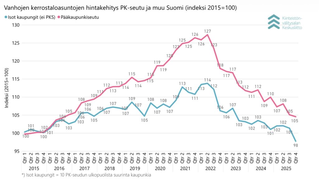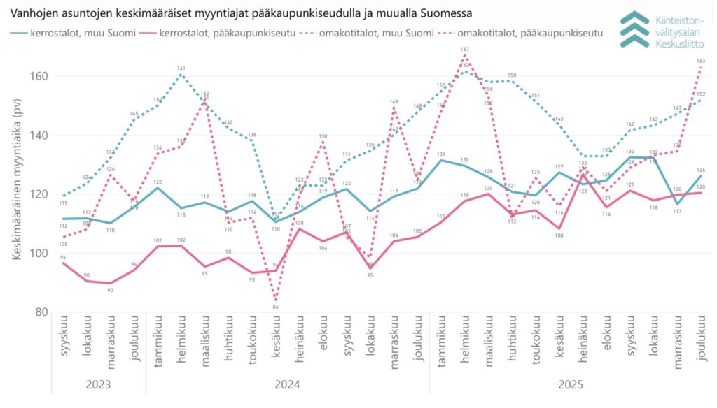 Asuntojen hinnat ovat huhtikuusta 2022 laskeneet koko Suomessa 2025 joulukuuhun noin 13 prosenttia. Samassa ajassa asuntojen myyntiajat ovat pidentyneet noin 65 prosenttia. Kun vuoden 2022 alkuvuodesta asunnon myyntiaika oli keskiarvoisesti noin 2,5 kuukautta, vuonna 2025 keskiarvo myyntiajalle oli yli neljä kuukautta.
