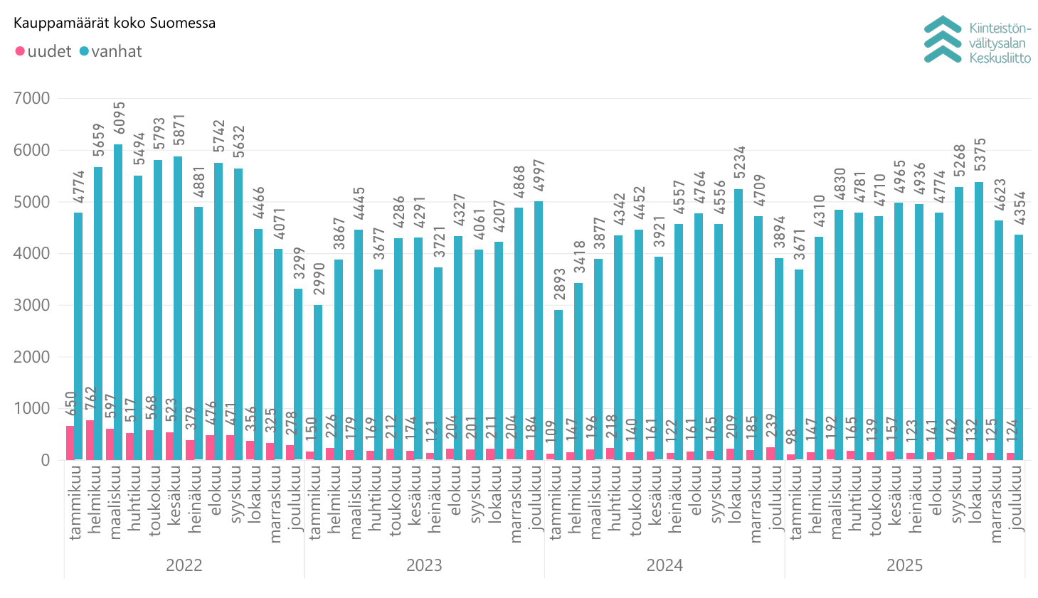 Vuonna 2025 tehtiin Kiinteistönvälitysalan Keskusliiton Hintaseurantapalvelun tietojen mukaan 58 282 asuntokauppaa. Näistä 1 685 oli uusia kohteita.