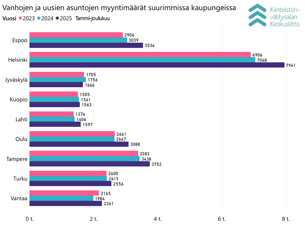”Pohjois-Pohjanmaalla ja Uudellamaalla asuntokauppa kasvoi voimakkaimmin. Oulu ja pääkaupunkiseutu olivat vuoden 2025 selkeät kasvualueet. Kaupunkien sekä asuntokaupan kasvu oli vuoden 2025 iso teema. Suurista kaupungeista ainoastaan Jyväskylässä asuntokauppoja tehtiin vähemmän kuin vuonna 2024”, Viljamaa selvittää.