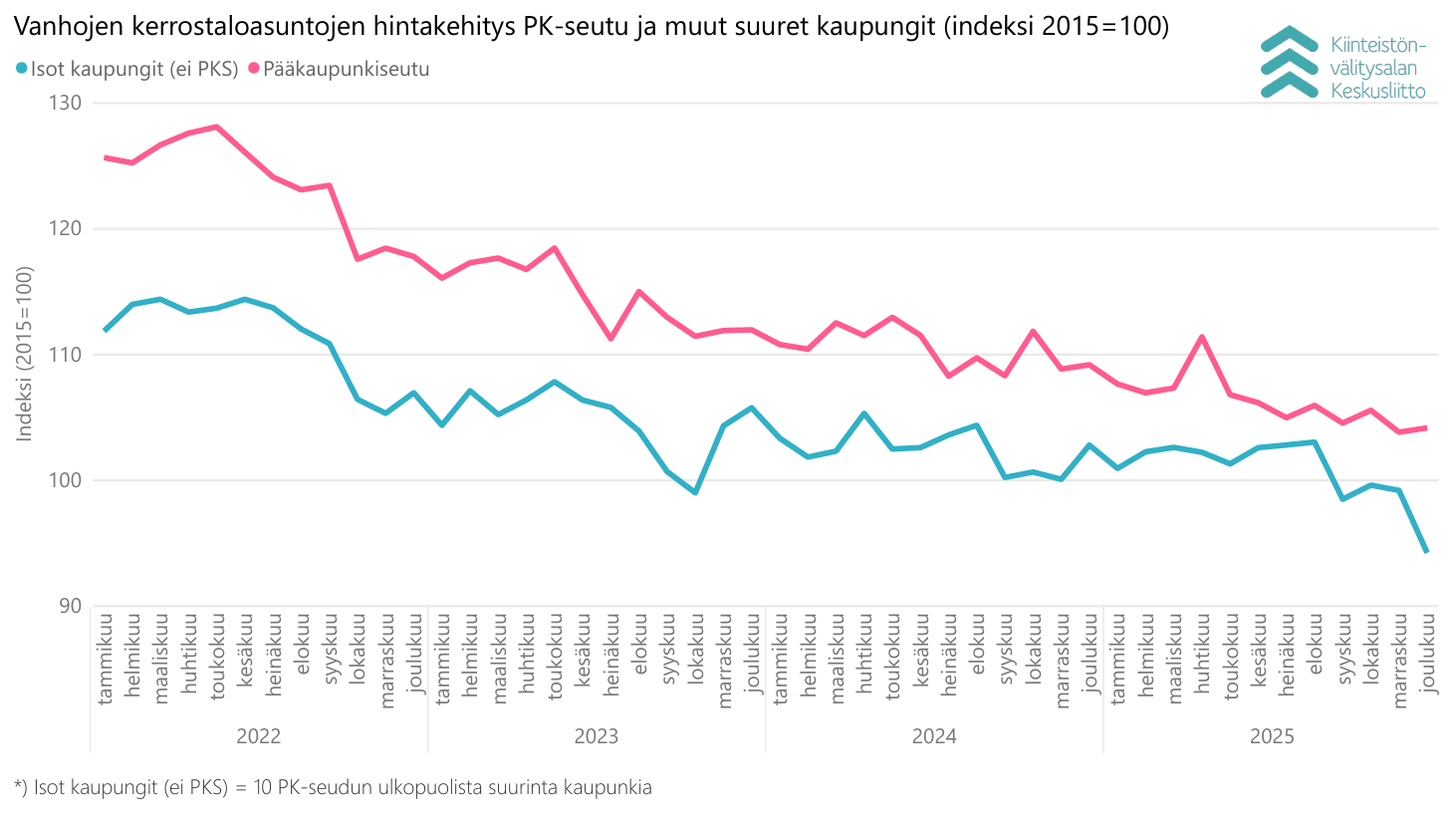 Käytettyjen kerrostaloasuntojen keskimääräiset neliöhinnat perustuen KVKL hintaindeksiin laskivat joulukuussa keskimäärin -5,0 % pääkaupunkiseudulla ja -8,6 % muissa suurissa kaupungeissa edellisvuoteen verrattuna. Oulussa ja Tampereella hinnat laskivat -2,4 %, Turussa -6,4 %.