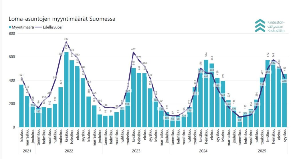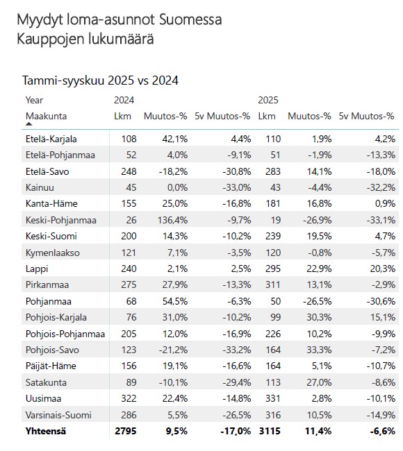 KVKL Hintaseurantapalveluun tallennetun datan perusteella heinä–syyskuussa myytiin yhteensä 1 534 loma-asuntoa, joista 1 528 olivat käytettyjä ja 6 uusia. Kauppamäärä on lähes sama kuin vuonna 2024 vastaavana aikana, jolloin myytiin yhteensä 1 537 loma-asuntoa.