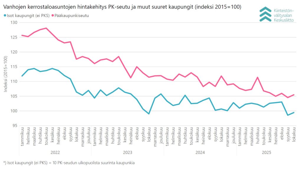 Käytettyjen kerrostaloasuntojen keskimääräiset neliöhinnat perustuen KVKL hintaindeksiin nousivat lokakuussa pääkaupunkiseudulla sekä muissa isoissa kaupungeissa 0,9 % syyskuuhun verrattuna. Oulussa hinnat nousivat 5,4 %, Turussa 5,1 % ja Tampereella ne laskivat -4,5 %.