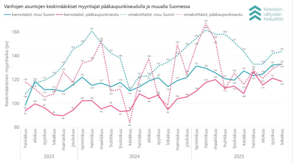 Lokakuussa keskimääräinen myyntiaika käytetyissä pääkaupunkiseudun kerrostaloasunnoissa oli 118 päivää (syyskuussa 121 pv), ja muualla Suomessa 133 päivää (syyskuussa 132 päivää). Rivitaloasunnoissa myyntiaika oli pääkaupunkiseudulla keskimäärin 118 päivää (syyskuussa 130 pv) ja muualla Suomessa 121 päivää (syyskuussa 127 päivää). Omakotitalojen keskimääräinen myyntiaika oli pääkaupunkiseudulla 133 päivää (syyskuussa 129 pv) ja muualla Suomessa 144 päivää (syyskuussa 142 päivää).