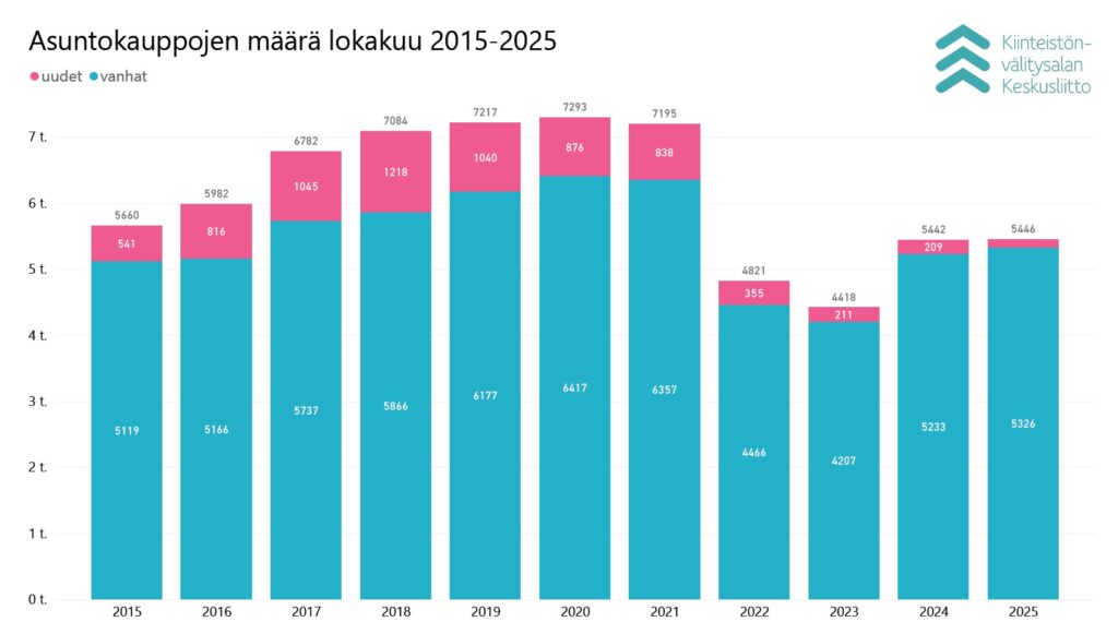 Lokakuussa Kiinteistönvälitysalan Keskusliiton ylläpitämään KVKL Hintaseurantapalveluun raportoitiin maanlaajuisesti yhteensä 5 326 kpl käytettyjen asuntojen kauppaa (1,8 % ed. vuosi, -0,2 % 5 v. ka) ja 120 kpl uudisasunnon myyntiä (-42,6 %, -75,9 % 5 v. ka), eli yhteensä 5 446 kpl asuntokauppoja (0,1 %, -6,6 % 5 v. ka). Lisäksi myytiin 385 kpl loma-asuntoa, 130 kpl tontteja, sekä 390 kpl muita välitysalan vaihdannan alaisia kohteita kuten liiketiloja, parkkipaikkoja tai varastoja. Lokakuun kokonaiskauppamäärä oli nämä mukaan lukien 6 351 kpl kohteita, mikä on -0,1 % vuoden 2024 lokakuun tasosta ja -6,4 % viiden vuoden keskiarvosta.