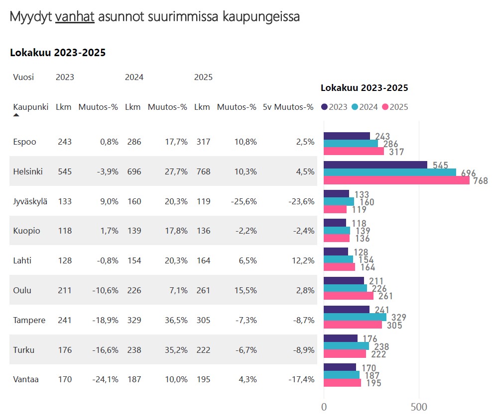 Käytettyjä asuntoja suurimmista kaupungeista myytiin eniten lokakuussa Helsingissä 768 kpl (10,3 % ed. vuosi, 4,5 % 5 v. ka), Espoossa 317 kpl (10,8 %, 2,5 % 5 v. ka) ja Tampereella 305 kpl (-7,3 % ed. vuosi, -8,7 % 5 v. ka). Prosentuaalisesti suurin muutos oli Jyväskylässä, jossa kauppamäärä 119 kpl jäi -25,6 % viime vuotta pienemmäksi.