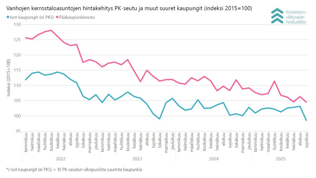 Vuoden takaiseen syyskuuhun verrattuna käytettyjen kerrostaloasuntojen keskimääräiset hinnat laskivat keskimäärin -3,8 % pääkaupunkiseudulla ja -1,7 % muissa suurissa kaupungeissa. Turussa hinnat laskivat -2,6 %, mutta nousivat Tampereella 1,0 % ja Oulussa 4,5 %.