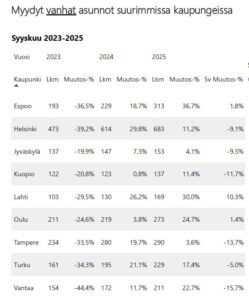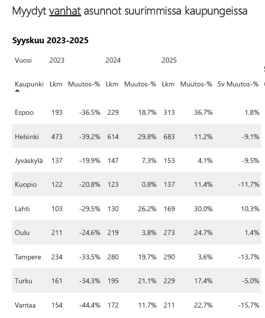 Asuntotyyppejä tarkastellessa syyskuussa myydyistä käytetyistä asunnoista 2 474 kpl (13,9 % vrt. syyskuu 2024, -8,6 % 5 v. ka) sijaitsivat kerrostaloissa, ja 1 336 kpl (18,3 % vrt. ed. vuosi, -3,2 % 5 v. ka) olivat rivitalo- tai paritaloasuntoja. Käytettyjen omakotitalojen tai erillistalojen kauppoja solmittiin valtakunnallisesti 1 399 kpl (11,6 %, -2,7 % 5 v. ka). Uusista asunnoista 92 kpl oli kerrostaloja (-29,8 %, -77,8 % 5 v. ka), 22 kpl rivitaloja (-24,1 % ed. vuosi, -78,4 % 5 v. ka) ja 15 kpl omakotitaloja (275,0 % ed. vuosi, -23,5 % 5 v. ka).