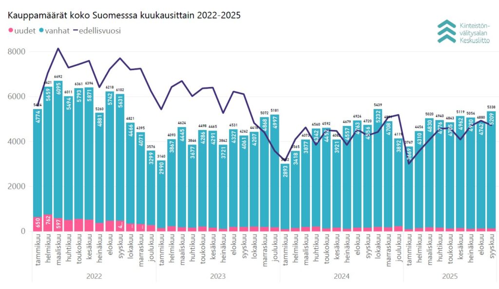 Syyskuussa Kiinteistönvälitysalan Keskusliiton ylläpitämään KVKL Hintaseurantapalveluun raportoitiin maanlaajuisesti yhteensä 5 209 kpl käytettyjen asuntojen kauppaa (14,3 % ed. vuosi, -5,7 % 5 v. ka) ja 129 kpl uudisasunnon myyntiä (-21,3 %, -75,9 % 5 v. ka), eli yhteensä 5 338 kpl asuntokauppoja (13,1 %, -11,9 % 5 v. ka). Lisäksi myytiin 447 kpl loma-asuntoa, 131 kpl tontteja, sekä 325 kpl muita välitysalan vaihdannan alaisia kohteita kuten liiketiloja, parkkipaikkoja tai varastoja. Syyskuun kokonaiskauppamäärä oli nämä mukaan lukien 6 241 kpl kohteita, mikä on 11,6 % vuoden 2024 syyskuun tasosta ja -12,2 % viiden vuoden keskiarvosta.