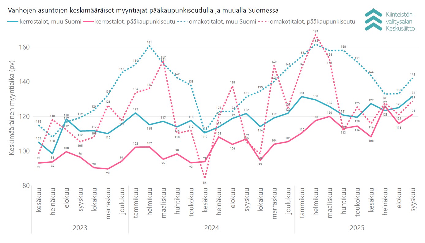 Syyskuussa keskimääräinen myyntiaika käytetyissä pääkaupunkiseudun kerrostaloasunnoissa oli 121 päivää (elokuussa 116 pv), ja muualla Suomessa 132 päivää (elokuussa 125 päivää). Rivitaloasunnoissa myyntiaika oli pääkaupunkiseudulla keskimäärin 132 päivää (elokuussa 113 pv) ja muualla Suomessa 128 päivää (elokuussa 122 päivää). Omakotitalojen keskimääräinen myyntiaika oli pääkaupunkiseudulla päivää 129 (elokuussa 121 pv) ja muualla Suomessa 142 päivää (elokuussa 133 päivää).