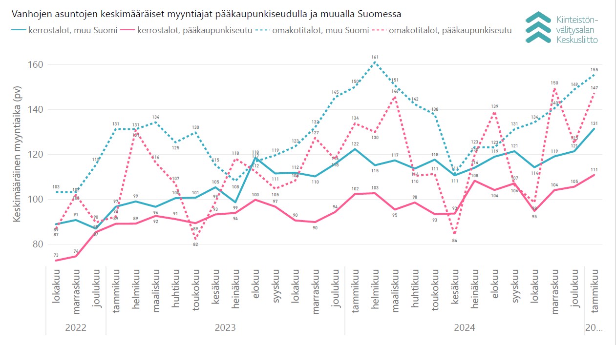 Tammikuussa keskimääräinen myyntiaika käytetyissä pääkaupunkiseudun kerrostaloasunnoissa oli 111 päivää (joulukuussa 105 pv), ja muualla Suomessa 131 päivää (joulukuussa 121 päivää). Rivitaloasunnoissa myyntiaika oli pääkaupunkiseudulla keskimäärin 131 päivää (joulukuussa 106 pv) ja muualla Suomessa 121 päivää (joulukuussa 113 pv). Omakotitalojen keskimääräinen myyntiaika oli pääkaupunkiseudulla 147 päivää (joulukuussa 125 pv) ja muualla Suomessa 155 päivää (joulukuussa 149 pv).