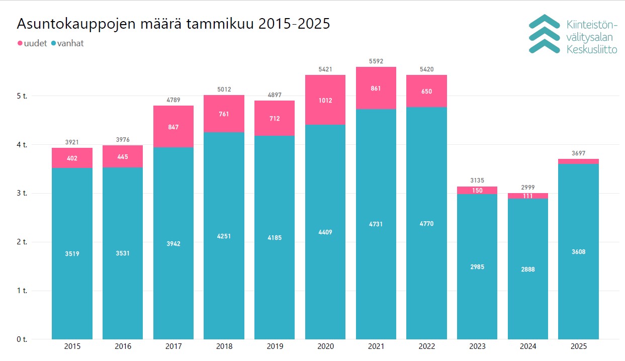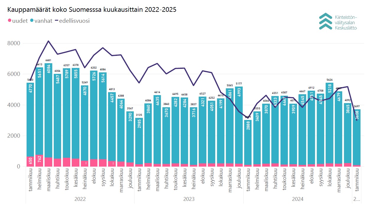 Tammikuussa Kiinteistönvälitysalan Keskusliiton ylläpitämään KVKL Hintaseurantapalveluun raportoitiin maanlaajuisesti yhteensä 3 608 kpl vanhojen asuntojen kauppaa (24,9 % tammikuu 2024, -8,8 % 5 v ka) ja 89 kpl uudisasunnon myyntiä (-19,8 %, -84,0 % 5 v ka), eli yhteensä 3 697 kpl asuntokauppoja (23,3 %, -18,1 % 5 v ka). Lisäksi myytiin 86 kpl loma-asuntoa, 82 kpl tontteja, sekä 292 kpl muita välitysalan vaihdannan alaisia kohteita kuten liiketiloja, parkkipaikkoja tai varastoja. Tammikuun kokonaiskauppamäärä oli nämä mukaan lukien 4 157 kpl kohteita, mikä on 20,0 % vuoden 2024 tammikuun tasosta ja -19,2 % viiden vuoden keskiarvosta.