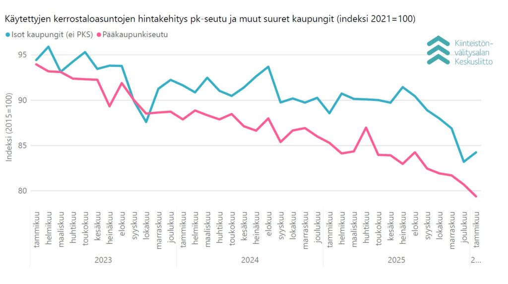 *) KVKL:n julkaisema vanhojen kerrostaloasuntojen hintaindeksi on päivittynyt vuoden 2026 alusta alkaen. Uusi perusvuosi on 2021=100 (edellinen 2015=100), ja indeksissä käytetty laatuvakiointi on päivitetty perustuen KVKL Hintaseurantapalvelun uusimpiin kauppatietoihin. Aiempi indeksisarja vuosilta 2015–2020 on ketjutettu päivitetyn indeksin 2021- kanssa.