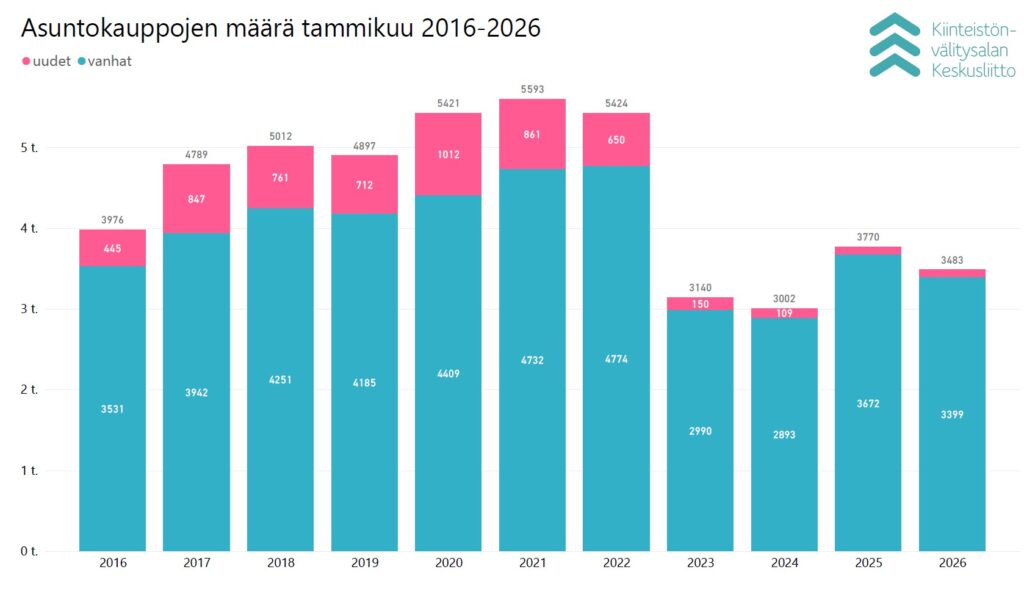 Tammikuussa Kiinteistönvälitysalan Keskusliiton ylläpitämään KVKL Hintaseurantapalveluun raportoitiin maanlaajuisesti yhteensä 3 399 kpl käytettyjen asuntojen kauppaa (-7,4 % ed. vuosi, -10,8 % 5 v. ka) ja 84 kpl uudisasunnon myyntiä (-14,3 %, -77,5 % 5 v. ka), eli yhteensä 3 483 kpl asuntokauppoja (-7,6 %, -16,8 % 5 v. ka). Lisäksi myytiin 114 kpl loma-asuntoa, 97 kpl tontteja, sekä 216 kpl muita välitysalan vaihdannan alaisia kohteita kuten liiketiloja, parkkipaikkoja tai varastoja. Tammikuun kokonaiskauppamäärä oli nämä mukaan lukien 3 910 kpl kohteita, mikä on -8,0 % vuoden 2025 tammikuun tasosta ja -18,3 % viiden vuoden keskiarvosta.