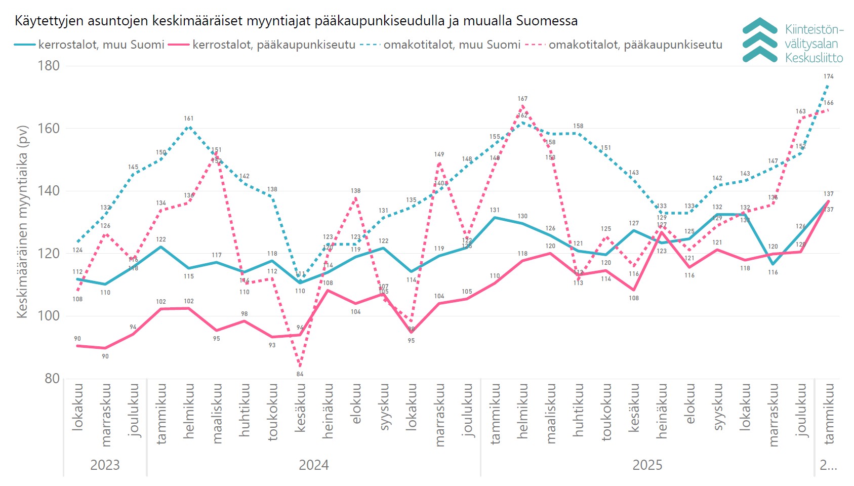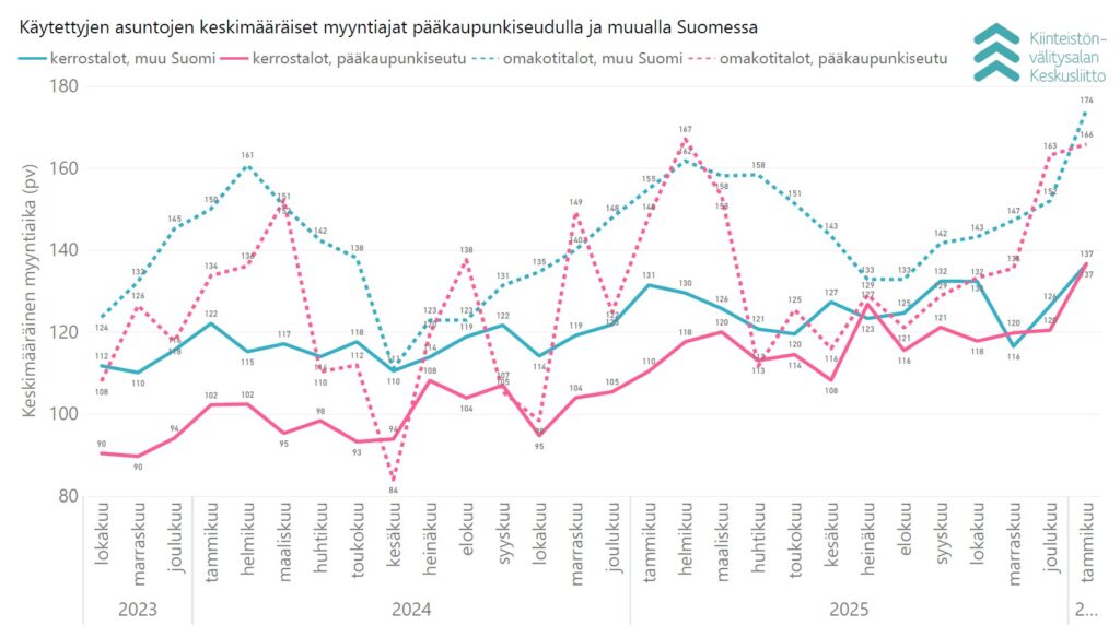 Keskimääräinen myyntiaika käytetyissä pääkaupunkiseudun kerrostaloasunnoissa oli 137 päivää (joulukuussa 120 pv), ja muualla Suomessa 137 päivää (joulukuussa 126 päivää). Rivitaloasunnoissa myyntiaika oli pääkaupunkiseudulla keskimäärin 117 päivää (joulukuussa 125 pv) ja muualla Suomessa 145 päivää (joulukuussa 124 päivää). Omakotitalojen keskimääräinen myyntiaika oli pääkaupunkiseudulla 166 päivää (joulukuussa 163 pv) ja muualla Suomessa 174 päivää (joulukuussa 152 päivää).