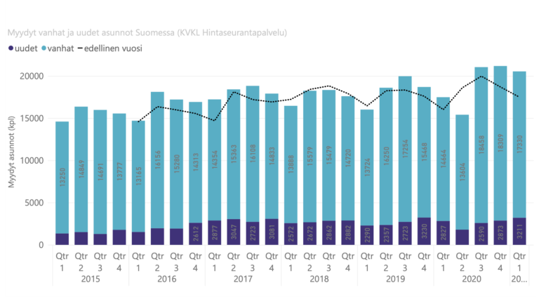 Tammi-helmikuussa myytiin yhteensä 10 523 vanhaa asuntoa, mikä on 11 % viime vuoden alkua enemmän. Kasvu on merkittävää, sillä vertailukohtana viime vuoden alku ennen koronarajoitusten alkua oli vilkasta aikaa asuntokaupassa.