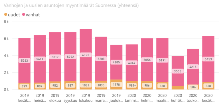 Toukokuussa myytiin yhteensä 6197 asuntoa, joista 5737 oli vanhaa asuntoa ja 753 oli uusia asuntoja. Vanhojen asuntojen myynti kasvoi 7,1 prosenttia ja uusien asuntojen kauppa jäi 10 prosenttia viime vuoden toukokuusta.