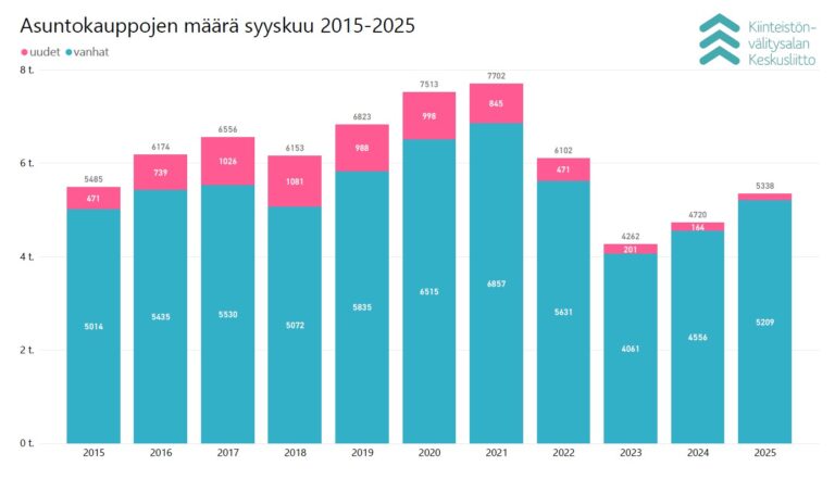 ”Asuntokauppamäärät nousivat syyskuussa vuoden ennätyslukemiin. Viimeiseen kolmen vuoden aikana vain yhtenä kuukautena tehtiin enemmän asuntokauppoja kuin syyskuussa. Asuntomarkkinoiden kehityksen näkökulmasta on huomionarvoista, että kauppoja tehtiin nyt enemmän kuin esimerkiksi vuoden 2019 syyskuussa”, kertoo Kiinteistönvälitysalan Keskusliiton toimitusjohtaja Tuomas Viljamaa.