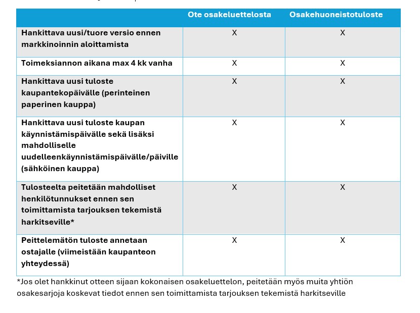 Toimeksiantoa suoritettaessa ote osakeluettelosta saa olla enintään 4 kuukautta vanha. Lisäksi välitysliikkeen pitää hankkia uusi ote kaupantekopäivälle, tai jos kauppa tehdään sähköisesti kaupankäyntijärjestelmässä, sille päivälle, jolloin kaupankäynti käynnistetään kaupankäyntijärjestelmässä. Em. ohjeistus koskee myös kaupan uudelleenkäynnistämistä/käynnistämisiä.