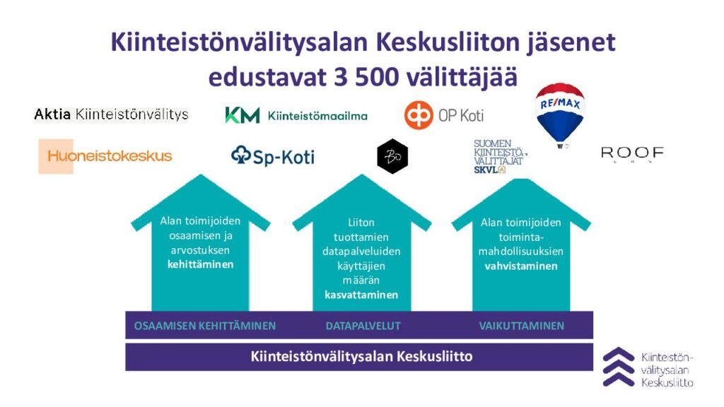 ”Toimimme ennakoivasti ja proaktiivisesti yhteistyössä sidosryhmien, päättäjien ja viranomaisten kanssa ratkaisten mahdollisia ongelmia ja kehittäen yhteiskuntaa. Turvallisten ja onnistuneiden asuntokauppojen mahdollistaminen on yhteiskunnallisesti erittäin tärkeää, ja se on myös kiinteistönvälitysalan keskeinen tehtävä. Kiinteistönvälitysalan Keskusliitto on erinomainen ja haluttu yhteistyökumppani, kun ratkotaan yhteiskunnallisia haasteita”, kertoo toimitusjohtaja Tuomas Viljamaa.